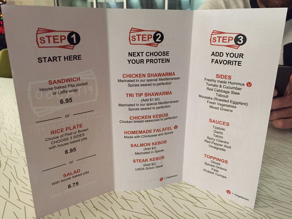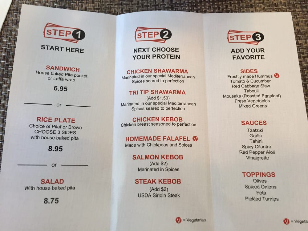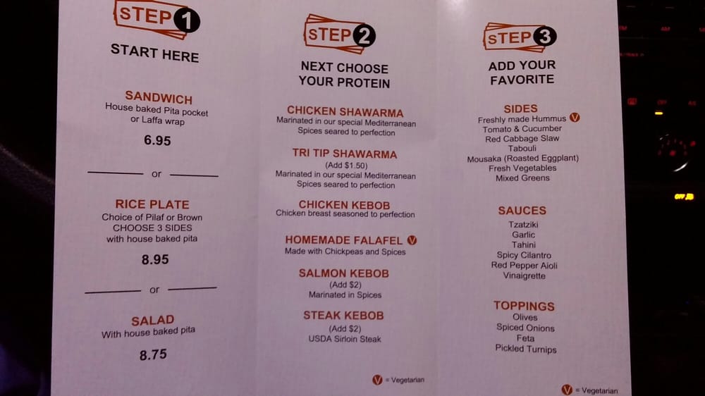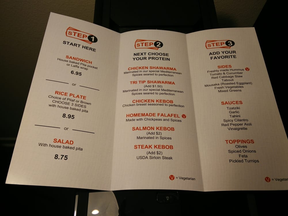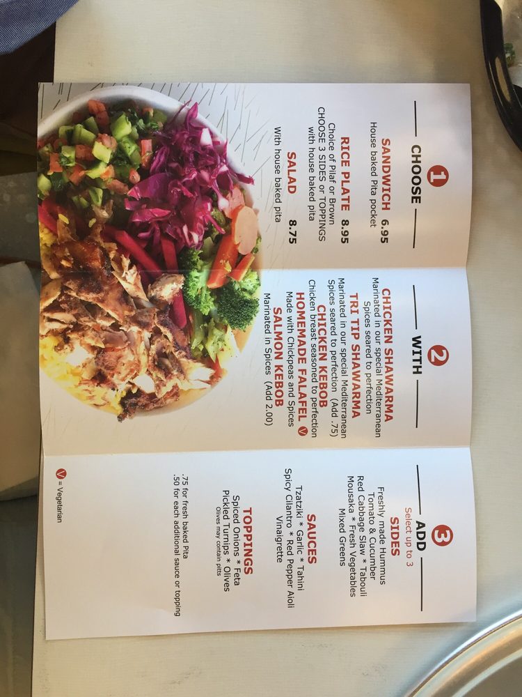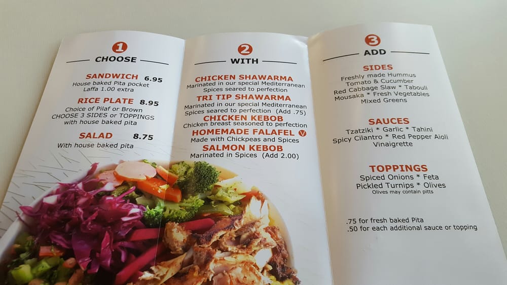 Choice of pilaf or brown, choice of 3 sides or toppings with house-baked pita.